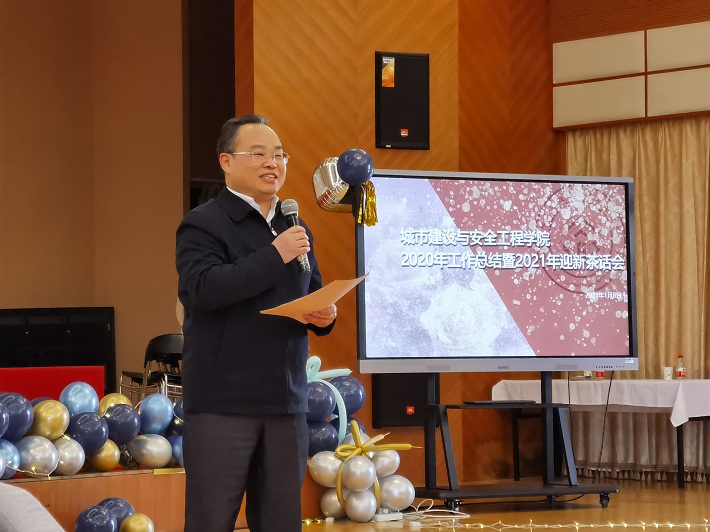 郭庆松向城建学院教职员工致以新年的祝福和诚挚的祝愿。他表示,城建学院2020年度工作很是出彩,亮点纷呈。在师资队伍建设、学科建设与专业发展、科学研究、课程思政、学生工作、党建工作等方面都取得了成效,在人才培养、立德树人方面做出了贡献。他要求,城建学院全体教师在2021年工作中团结一心,携手奋进,始终保持坚定正确的政治方向,以更加振奋的精神,与时俱进,开拓创新,在未来大有可为,大显身手,大展宏图。