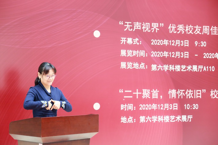 优秀校友周佳艺用手语向母校对自己和其他特教班学生的悉心培养表示真挚的感谢。她表示,母校是一生难以忘怀的词汇,深深地镌刻在脑海里,永恒地驻足在心里。现在再次回到亲爱的母校,并且能够在母校举办个人作品展,是莫大的荣幸和幸运。今后将把她的经历分享给更多的聋人孩子,鼓励聋人孩子们自强不息,奋勇向前。