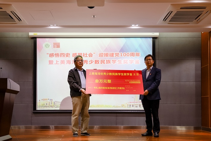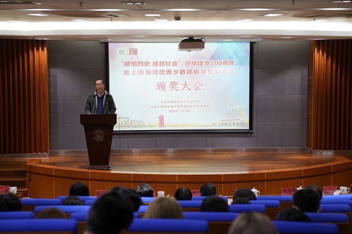 11月23日下午,人文学院和奉贤海湾旅游区联合主办的“感悟四史,感恩社会”迎接建党100周年暨“上美海湾优秀少数民族学生奖学金”颁奖大会举行,校党委副书记、纪委书记何星海出席并致辞。