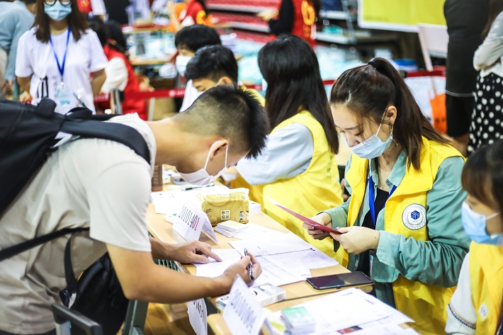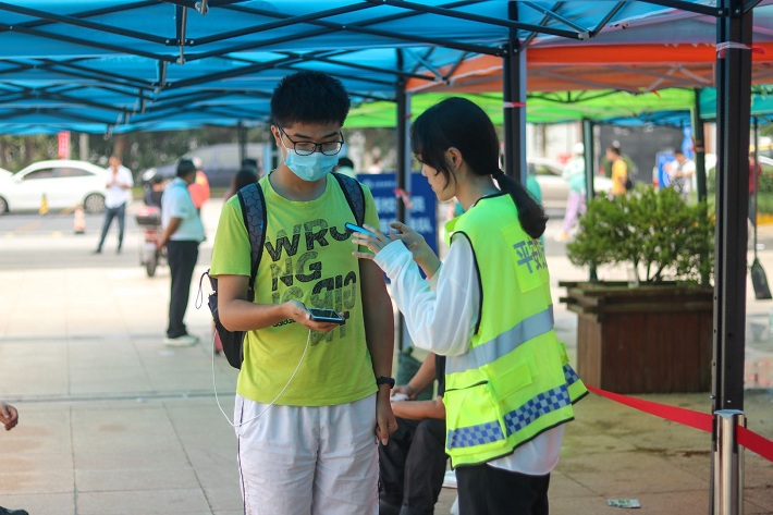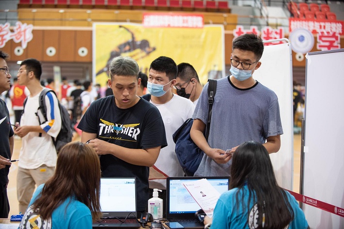 报到现场,每位新生通过身份核验、体温检测、健康码监测后进入学校,“摆渡车”直接进宿舍入驻,“行李减负”后轻松到场办理相关手续,“一站式”贴心服务,极大地简化了新生入学报到手续;体育馆大厅竖起的“迎新智慧大屏”,实时展现学校整体报到人数和各学院报到数据,给予新生入校强烈的归属感。