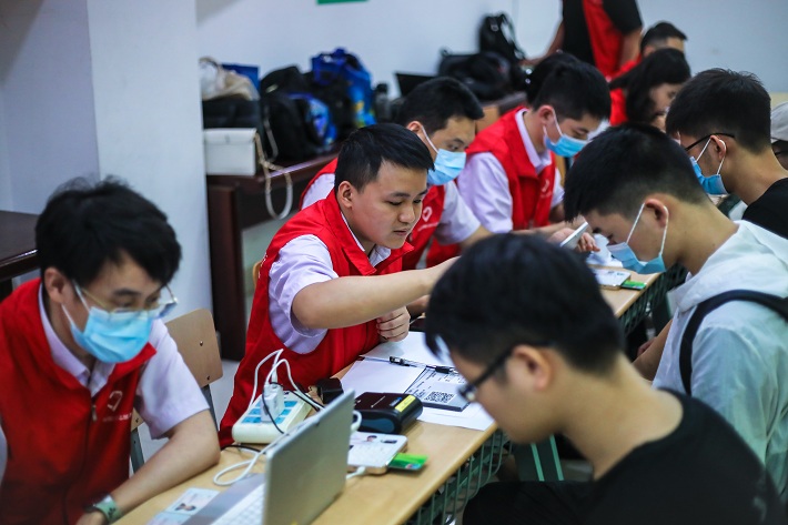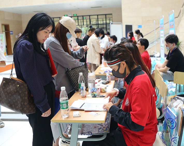 校园内,随处可见的志愿者为新生答疑解惑、搬运行李,提供“一对一”服务;校园迎新入口处安排了免费饮用水和医疗救护点;各公寓楼下设立服务点,引导新生进入宿舍;同时,学校为贫困生提供绿色通道服务,为经济困难学生解决后顾之忧。