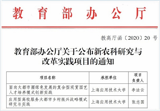 我校获批项目分别为生态学院院长李法云主持的《面向大都市圈绿色发展的复合型观赏园艺人才培养模式创新实践》和上海高校智库首席专家张志国主持的《应用型高校服务大都市乡村振兴战略模式研究与实践》。此前,这两个项目与生态学院党总支书记曹扬主持的《以植物应用为特色、多学科交叉融合的园林人才培养模式机制创新实践 》项目共同入选了上海市级新农科研究与改革实践项目。