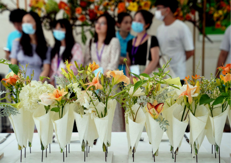 6月13日,开幕式现场展示的萱草花小花束。