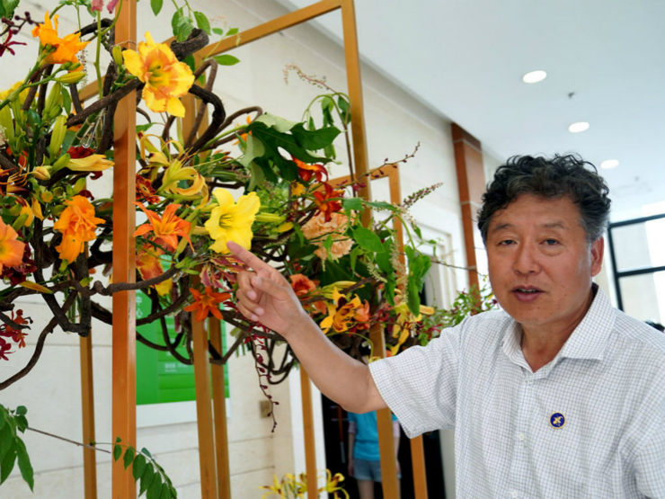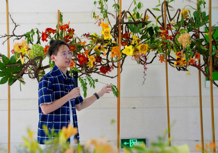 6月13日,第45届世界技能大赛花艺项目冠军、上海应用技术大学学生陆亦炜在介绍自己的“母亲花”花艺作品。