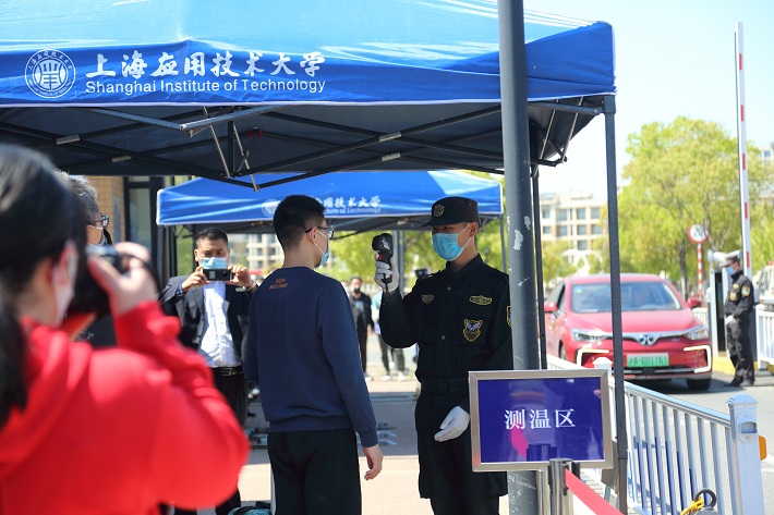 在奉贤校区海泉路500号校门,师生根据引导依次间隔1米以上排队等候,主动展示绿色健康码,进入红外线测温区,体温正常的师生凭校园一卡通身份识别后进入校园;经检测体温异常者,被带往临时隔离区,志愿者、医护人员、辅导员、应急车辆等立即启动相关应急处置预案,全流程闭环处置。在学生宿舍楼门口排队等候、体温检测、临时休息区、寝室间、浴室错峰使用管理等等井井有条。食堂排队入室、体温检测、洗手消毒、排队购买套餐、一人一桌等标识清晰。图书馆入口体温检测、阅览区单人单座、书籍借阅后暂时不还、房间集中消毒等方案明确。在工训二馆化工实验室,演练了申请实验、体温检测及入室、实验室操作规范、体温异常处置等等关键环节。
