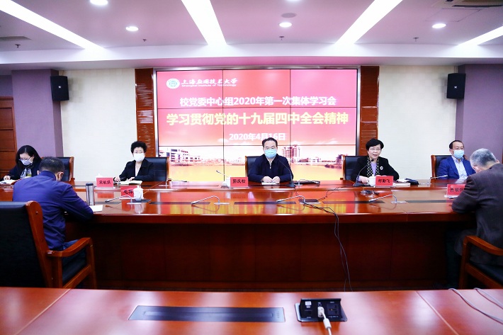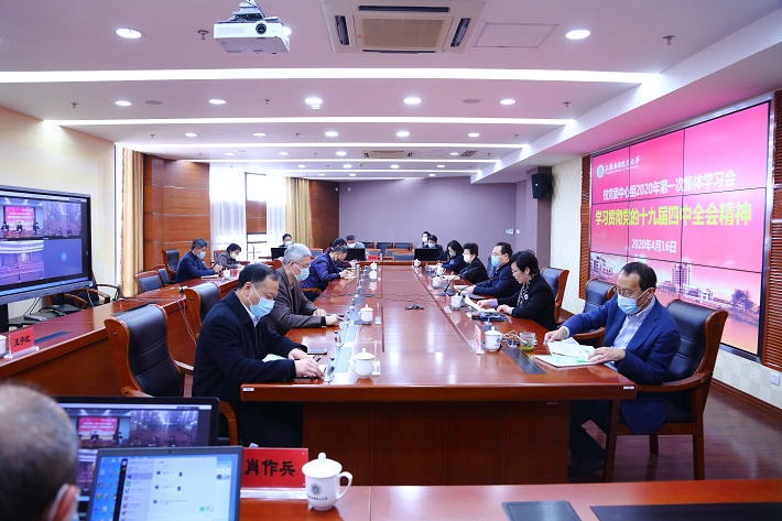 4月16日,校党委理论学习中心组举行2020年第一次集体学习会,进一步深入学习贯彻党的十九届四中全会精神,校党委书记、理论学习中心组组长郭庆松作主讲报告。校党委副书记、校长、理论学习中心组副组长柯勤飞主持。全体校领导、全体党委委员在奉贤校区行政楼417主会场参加学习会。