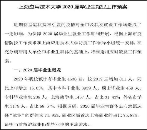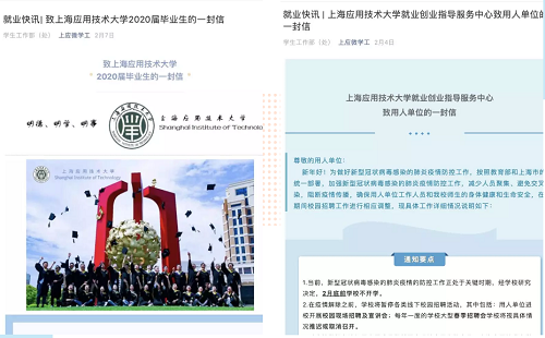 疫情发生后,学校密切关注疫情对就业工作的潜在影响,迅速成立以校党委副书记宋敏娟为组长的就业应对专项工作领导小组,主动对接教育及人社部门有关就业工作部署,迅速召开全校就业工作专题视频会议,在充分调研用人单位和毕业生群体的基础上,出台《上海应用技术大学2020届毕业生就业工作预案》。预案突出在防疫期间由就业应对工作领导小组统筹、协调、指导及监督各学院毕业生就业工作,并在2月初以“一封信”的形式分别向用人单位及毕业生告知疫情期间就业沟通联络渠道及就业事务网络办理流程,帮助毕业生坚定求职就业信心。