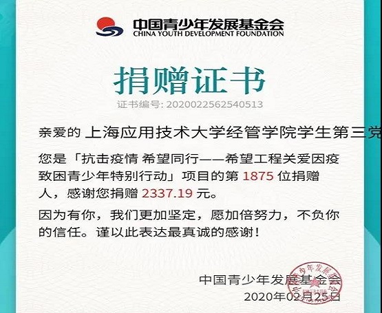 为坚决打赢疫情防控阻击战,按照党中央和上海市委的统一部署和要求,学校党委号召全校广大共产党员通过所在党支部踊跃捐款,支持疫情防控工作。学校党委代收党员自愿捐款后上缴上级单位,主要用于慰问战斗在疫情防控斗争第一线的医务人员、基层干部群众、公安民警和社区工作者等,资助因患新冠肺炎而遇到生活困难的群众和因患新冠肺炎去世的群众家属,慰问在疫情防控斗争中牺牲的干部群众家属等。