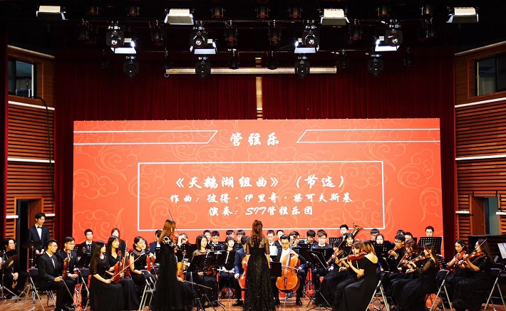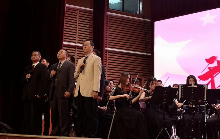 音乐会以气势宏大的国庆阅兵背景音乐《钢铁洪流进行曲》拉开序幕,学生乐手们先后演奏了《玫瑰狂欢节序曲》《天鹅湖组曲》《世纪序曲》《我爱你中国》十余首中外名曲,让现场观众沉浸在经典音乐的美妙享受中。宋敏娟、何星海欣然应邀分别登台,与教工合唱团成员一起即兴献唱了《我的中国心》和《绒花》。音乐会在管弦乐《红旗颂》的不朽旋律中落下帷幕。