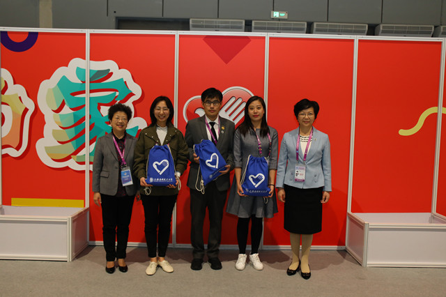 王瑛前往综合服务区和展台,慰问在现场承担翻译服务的外国语学院学生团队,希望大家认真对待每一次的洽谈交流,争做服务进博的一片绿叶。