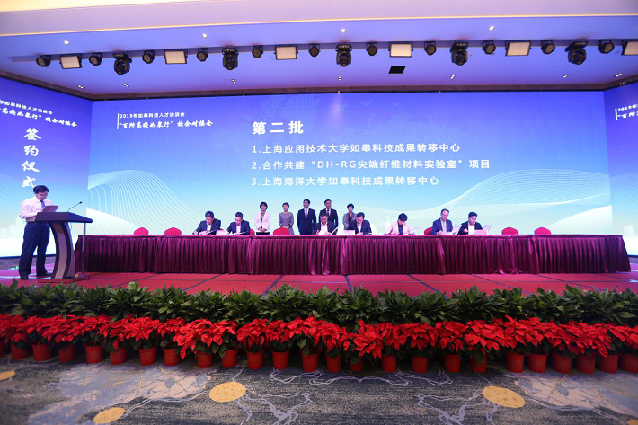 在“百所高校如皋行”校企对接会上,毛祥东代表学校与如皋市科技局签约成立上海应用技术大学如皋科技成果转移中心;我校材料学院高群教授与江苏曜彰体育用品有限公司进行项目签约。