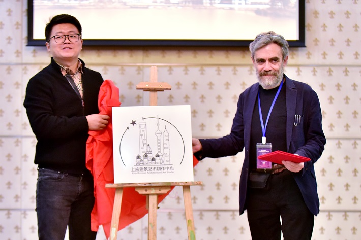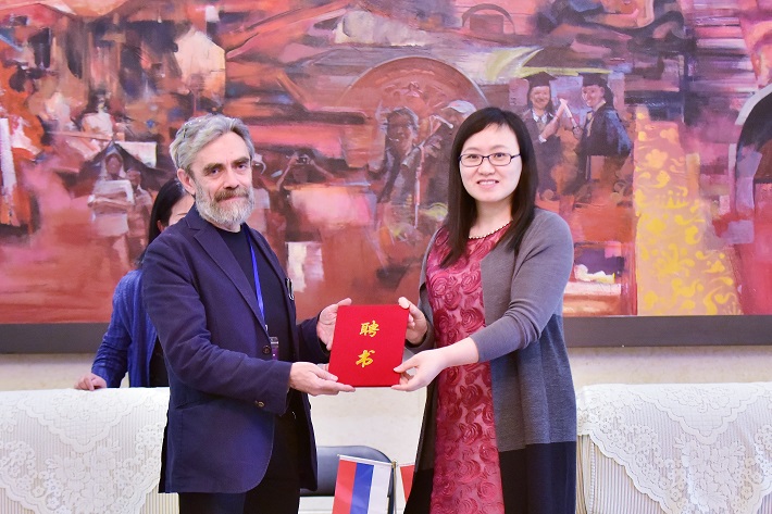 王瑛代表学校向谢尔盖颁发了兼职教授证书。同时还揭牌成立了上应建筑与艺术创作中心。