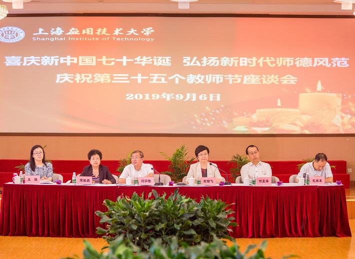 为隆重庆祝第35个教师节,9月6日下午,学校举行“喜庆新中国七十华诞 弘扬新时代师德风范”——庆祝第35个教师节座谈会。校党委书记刘宇陆讲话,代表校党委向全体教职工致以节日的问候和亲切的慰问。校党委副书记、校长柯勤飞致辞并主持会议。校党委副书记宋敏娟,校党委副书记、纪委书记何星海,校党委副书记、副校长王瑛,副校长毛祥东出席座谈会。离退休教师代表,各学院教师代表,部分职能部门、各学院(部)主要负责人,学生代表等80余名师生齐聚一堂,共庆新中国70华诞,共享光荣教师节,共话立德树人初心,共商新时代上应大发展。
