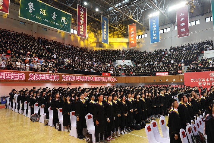 最后,典礼在全场高唱《歌唱祖国》的嘹亮歌声里圆满结束。典礼结束后,各学院在分会场为毕业生颁发毕业证书和学位证书。
