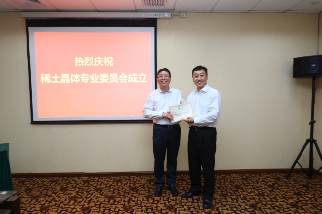 5月15日至18日,第九届国际稀土开发与应用研讨会暨2019中国稀土学会学术年会在北京召开,中国稀土学会稀土晶体专业委员会宣布成立,中科院长春应用化学研究所副所长、稀土资源国家重点实验室主任薛冬峰研究员当选稀土晶体专业委员会主任,我校材料学院院长徐家跃教授等人当选副主任,中国稀土学会理事长李春龙教授为他们颁发聘书并致辞。