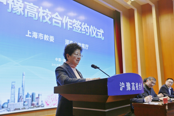 宋敏娟代表上海高校在签约仪式上讲话,她着重介绍了我校响应沪豫合作号召,与洛阳理工学院先行先试,在教师和干部培养方面所开展的富有成效的实践和探索。