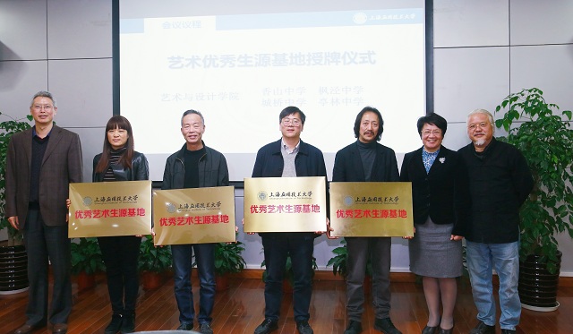 张锁怀和艺术学院院长林迅向上海市区示范中学香山中学、城桥中学、华东师范大学附属枫泾中学、亭林中学进行了我校优秀艺术类生源基地授牌。