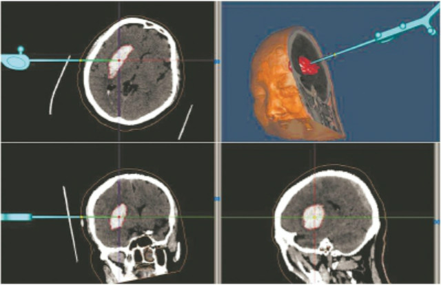 运用系统,医生在术前设计手术方案,能选择最便捷、安全的手术入路;术中适时准确指出手术部位和靶灶的三维空间位置,并显示术野周围结构,及时调整手术方向,引导手术医生直接准确到达病灶。尤其对于重要功能区以及深部小病灶,更加显示其优越性。深部血肿如丘脑、中脑区血肿也可以利用导航系统引导及机器臂准确穿刺。
