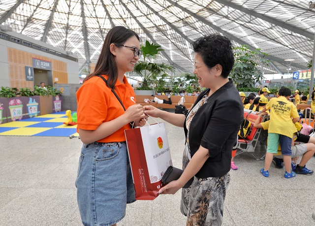7月27日,校党委副书记宋敏娟在上海南站欢送我校材料学院赴重庆服务的西部计划志愿者邓茹月同学。
