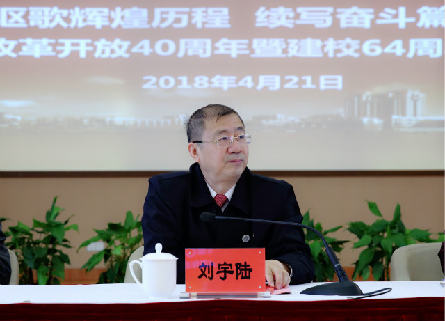 校党委书记刘宇陆在座谈会上发表讲话,代表学校党政向不辞辛劳与会的各位领导和来宾、向风尘仆仆回家的各位校友表示热烈的欢迎!向六十多年来为学校建设发展贡献智慧和心血的前辈们表示崇高的敬意!向广大师生员工致以诚挚的问候和节日的祝贺!