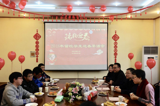 2月14日下午,我校举办2018年寒假留校学生迎春茶话会。校党委副书记、校长陆靖,校党委副书记、副校长张艳萍出席。校办主任王占勇、校党委学工部部长袁翔,校办、后勤保障处、学工部相关负责人,部分学院相关负责人及辅导员,学生资助管理中心全体人员与留校学生共同参加。