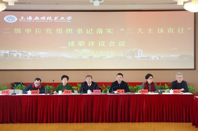 为全面学习贯彻党的十九大精神和习近平新时代中国特色社会主义思想,按照新时代党的建设的总要求,推动全面从严治党向基层延伸,根据中央和上级关于意识形态工作、基层党建工作、党风廉政建设和党内监督工作三大主体责任贯彻落实的总体安排,校党委于1月15日召开了2017年度学校二级单位党组织书记落实“三大主体责任”述职评议会。校党委书记刘宇陆, 校党委副书记、校长陆靖, 校党委副书记、纪委书记宋敏娟, 校党委副书记、副校长张艳萍, 副校长陈东辉, 副校长张锁怀出席会议。全体党委委员、二级单位党组织书记、党支部书记代表参加会议。上海电子信息职业技术学院党委书记田钦、上海大学党委统战部部长曹为民、上海中医药大学党委组织统战部部长夏文芳等校外专家应邀出席会议。陆靖主持会议。