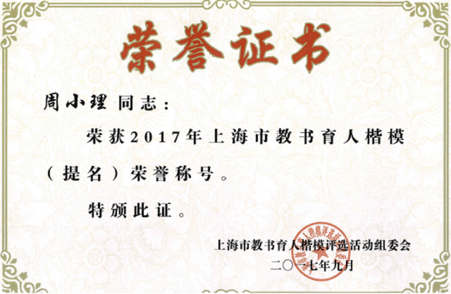 9月10日,周小理教授参加由市教卫工作党委、市教委举办的“光荣与使命”2017年上海市庆祝第33个教师节交响音乐会,并接受了表彰。