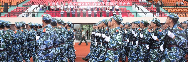 大会举行了庄严的升旗仪式。随后“八一”军旗和我校校旗在护旗手的护卫下进入会场。陆靖在军训团常务副团长马珺昶和校武装部部长、军训团副团长杨军的陪同下,踏着矫健的步伐检阅学生方阵。