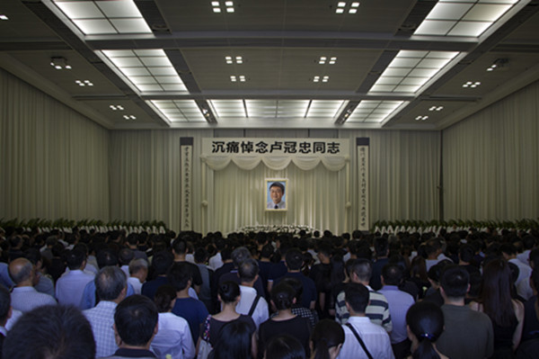 告别仪式大厅内,“沉痛悼念卢冠忠同志”九个大字格外醒目,挽联高悬,气氛肃穆,卢冠忠同志遗像悬挂正中央。大家怀着沉痛的心情,深切悼念卢冠忠同志。