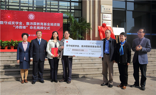 11月7日,我校举行詹沛霖教育基金、詹守成奖学金捐资暨“沛霖楼”命名揭牌仪式。校党委书记刘宇陆、副校长陈东辉与詹守成家属詹君湜、詹君铭共同为“沛霖楼”揭牌。詹守成家属再次向学校捐资160万元(迄今詹守成先生家庭累计向学校捐赠600万元)。为褒扬詹守成先生家庭无私奉献、情系教育的家国情怀和大爱精神,经学校研究,将第四学科楼命名为“沛霖楼”。今年8月,我校报送的“詹守成家庭三代人13年不间断的爱心延续”,被评为2015年度上海市社会主义精神文明好人好事(上海高校唯一)。