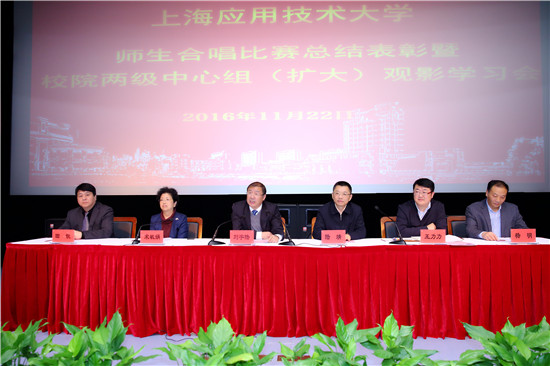 11月22日,学校举行师生合唱比赛总结表彰暨校院两级中心组(扩大)观影学习会。校党委书记刘宇陆,校长陆靖,校党委副书记、纪委书记宋敏娟,市教卫工作党委宣传处处长助理、上海教育报刊总社副社长王力力,校党委常委、党委组织统战部部长田钦,校党委常委、党委宣传部部长杨明出席会议,共同为师生合唱比赛获奖单位颁奖,并集体观看了重大革命历史题材电影《遵义会议》。会议由宋敏娟主持。
