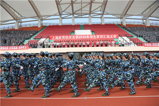 9月9日上午,我校2016年军训汇报大会在奉贤校区西田径场隆重举行。校党委书记刘宇陆,校长陆靖,党委副书记、纪委书记宋敏娟,党委副书记、副校长张艳萍,副校长叶银忠、陈东辉、张锁怀及上海警备区特警团少校、上海应用技术大学学生军训团团长徐厚立出席大会。大会由张艳萍主持。