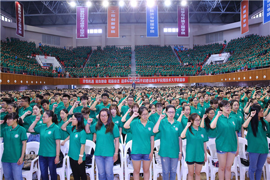 在开学典礼上,隆重举行了新生入学宣誓仪式。新同学们佩戴着校徽庄严宣誓:“我是上海应用技术大学学生,我愿以责任浇铸青春年华,厚德精技,砥砺知行,承工匠精神,养人文底蕴,求科学真理,担天下道义,明德明学明事,尽心尽力尽志,报效祖国,不辱使命,为实现中国梦而努力奋斗!”
