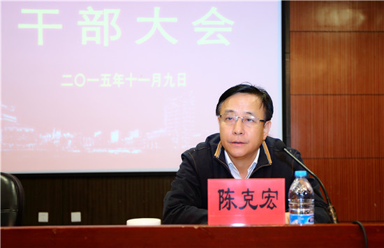 2015年11月9日,学校在徐汇校区图文信息楼召开干部大会,宣布上海市委、市人民政府关于上海应用技术学院领导班子主要成员调整的决定。市委组织部副部长陈皓同志宣布市委、市政府有关干部任免的决定并作重要讲话,市教卫工作党委书记陈克宏同志主持会议。刘宇陆同志、陆靖同志分别作表态发言。市委组织部宣教科技干部处处长夏明林同志、市教卫工作党委组织部干部处处长吴毅同志出席会议。
