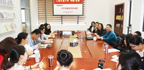 5月25日,上海交通大学博士生导师常辉教授应外国语学院邀请做“大学英语改革出路”专题讲座。副院长孙志青主持,大学英语教研部主任及二十多位大学英语课程负责人及骨干教师参加讲座。常辉回顾我国近20年的大学英语改革,总结其根本问题;然后提出大学英语改革需要构建大学英语系统,并详细阐述该系统的三大要素“学”、“教”、“测”之间的关系,接着以上海交通大学的大学英语改革实践为例阐释如何构建大学英语系统;最后讲述大学英语改革还需努力的工作。
