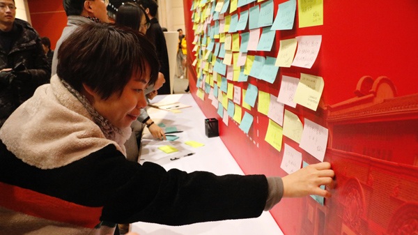 参观过程中,师生党员们就展出作品的艺术表现形式及作品背后的历史意义展开热烈讨论。通过欣赏艺术作品,党员同志们更深刻地领会了中国共产党的光辉历程和伟大成就,纷纷在留言墙上留下“不忘初心,共筑中国梦”、“为中华崛起而努力奋斗”的真切感想。