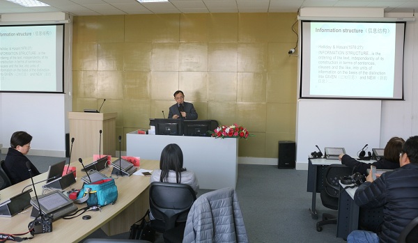 11月24日,外国语学院邀请华东师范大学博士生导师张春柏教授来作题为“汉英信息结构对比与翻译”专题学术讲座。讲座由学院副院长于静主持,学院党总支书记李晓晶及四十多位教师参加讲座。张春柏介绍了韩礼德英语衔接理论和英汉对比研究领域相关成果,及对翻译实践的指导意义,与在座教师交流了目前翻译研究中的共性问题,并就翻译学科方面的教学、科研及翻译实践等问题回答大家的问题。