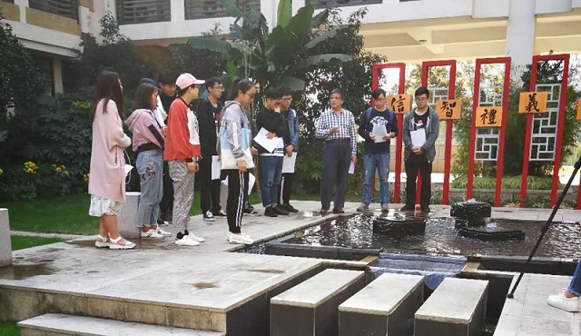 11月2日下午,在富有文化韵味的第五学科楼思贤庭内,人文学院院长刘红军继续开讲校本综合课程——《景观物语草木关情——文化校园十讲》之第五讲,主题为《思贤庭内念言偃》。刘红军首先带领同学们来到思贤庭内刻有“仁、义、礼、智、信”的屏廊前,对其中蕴含着的丰富儒家思想进行详细诠释,进而引出今天所讲的主题人物——言偃。行至喷泉,刘红军“以水为引”与同学们进行交流,和大家探讨了“智者如水,仁者如山”的故事,并诚恳告诫同学们在今后的学习生活中要有智者如水的情怀和水滴石穿的精神。最后向同学们介绍了思贤庭内的杏坛的典故——相传孔子聚徒授业讲学之处。