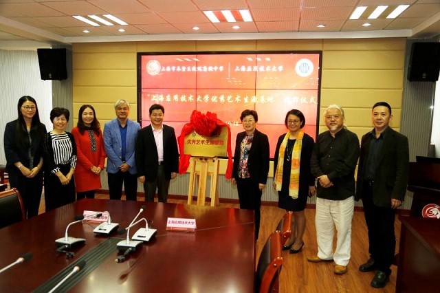林迅与李龙权代表双方签署合作协议,孙桂娟与万国良为“上海应用技术大学优秀艺术生源基地”揭牌。