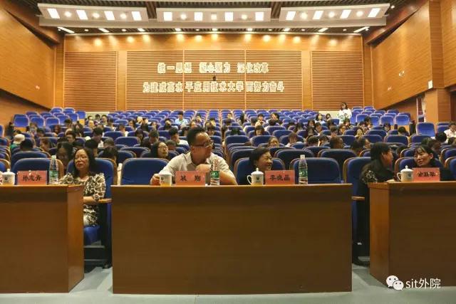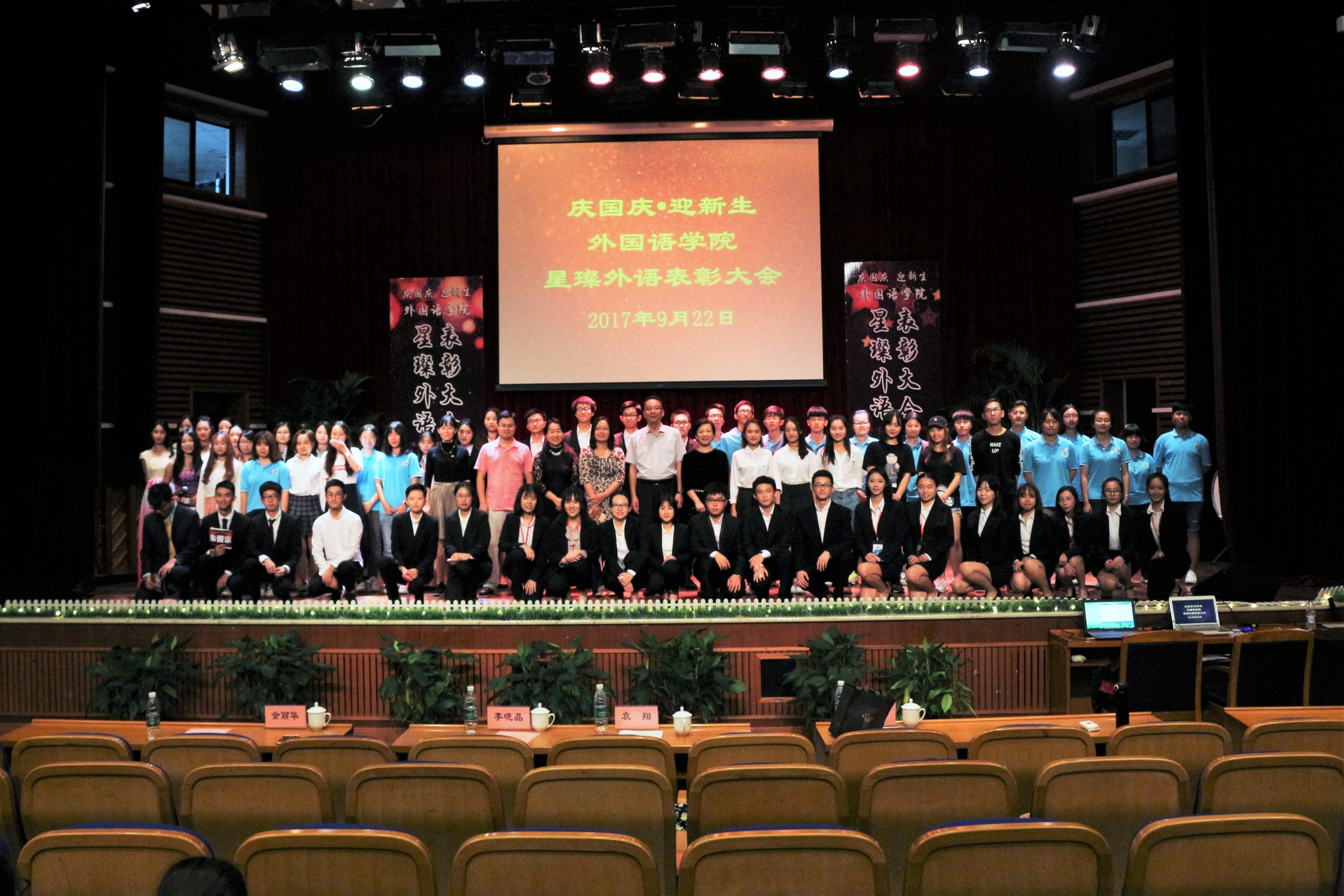 9月22日,外国语学院举行2017年“庆国庆 迎新生”星璨外语表彰大会。党委学生工部部长、学生处处长袁翔,外国语学院党总支书记李晓晶,党总支副书记、副院长金丽华,副院长孙志青,英语系主任程庆华,德语系主任徐林峰出席。2017届外国语学院全体新生参加大会。
