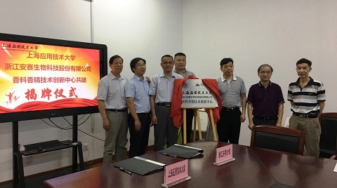 7月7日,香料学院与校友企业浙江安赛生物科技有限公司举行香料香精技术创新中心共建签约暨揭牌仪式。香料香精联合党委书记王化田,香料香精联合党委副书记、副院长陈翔,浙江安赛生物科技有限公司董事长、原轻专调香专业毕业校友王颖、邹建凯总工程师,香料学院部分师生共同参加签约暨揭牌仪式。仪式由香料学院副院长冯涛主持。