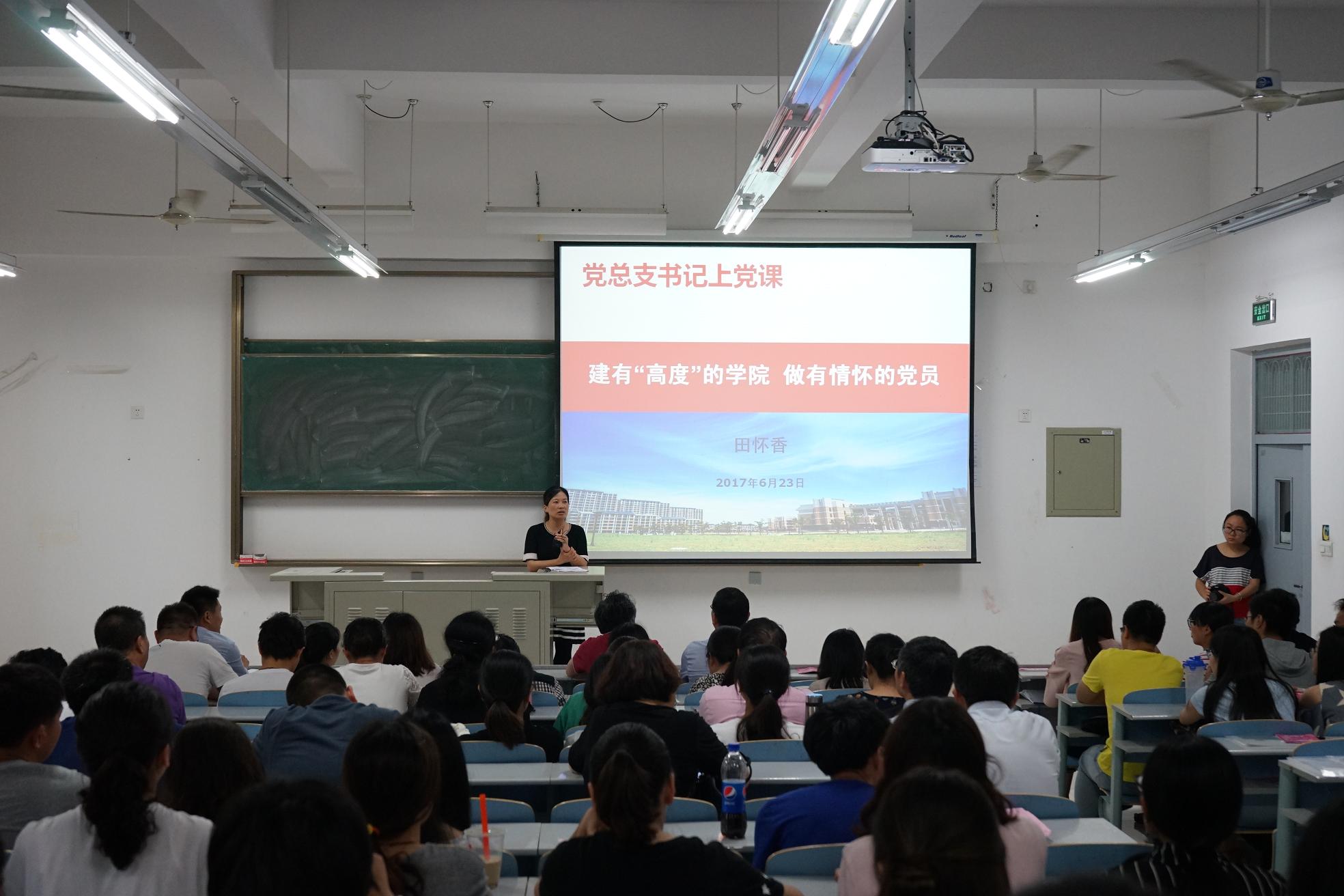 6月23日,材料学院党总支书记田怀香为学院全体师生党员以《建有高度的学院 做有情怀的党员》为题上党课,介绍了上海市第十一次党代会基本概况和精神。她表示,教师应将教书与育人相统一、言传与身教相统一、潜心问道与关注社会相统一、学术自由与学术规范相统一,真正做到“落实精神,体现高度,彰显情怀”;她对推进“两学一做”学习教育常态化制度化的具体工作进行了部署,并要求:全面动员,明确具体要求和标准;干部带头,率先垂范;查找问题,补好短板;基层党建与中心工作协调发展。她希望各支部组织开展好“学”与“做”相关活动,切实发挥党支部战斗堡垒作用和党员先锋模范作用。