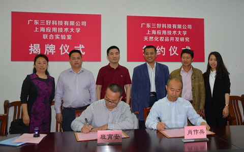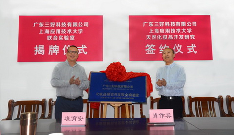 5月5日,香料学院与广东三好科技有限公司举行联合实验室揭牌暨“天然化妆品开发研究”项目合作协议签约仪式。香料学院院长、上海香料所所长肖作兵,香料香精联合党委书记王化田,广东三好科技有限公司总经理班育安、研发总监畅绍念、副总经理班育庭,香料学院部分师生参加揭牌和签约仪式。