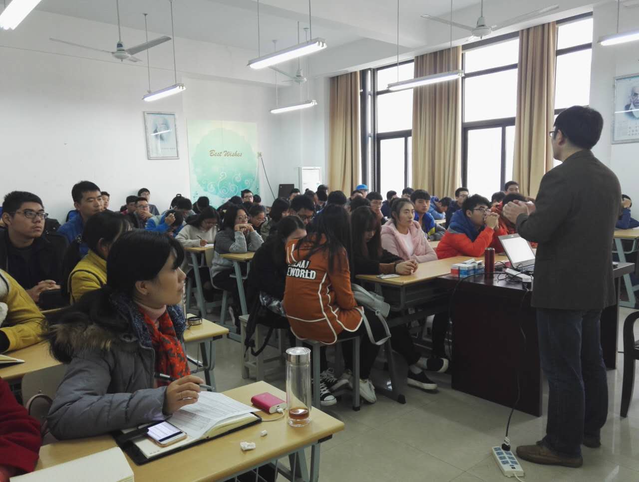 邱翔对理学院学生上课情况提出了要求,要求课堂上不使用手机及校园网络,并将此与期中考试成绩联系起来,希望学生们保持良好的课堂纪律。牛亏环要求全体学生首先要树立目标,其次要学会思考、付出行动,在遇到困难时要坚持克服,以现在为起点,找准自己的定位。