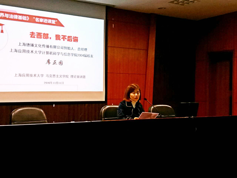 11月11日,我校计算机科学与信息学院2004届毕业生、大学生西部志愿者、上海德播文化传播有限公司总经理席正园应邀走进《思想道德修养与法律基础》课堂,以“去西部,我不后悔”为主题,给在校大学生上了一堂别开生面的思想政治课。来自艺术与设计学院、高职学院近200名学生及马克思主义学院部分教师聆听了此次讲座。