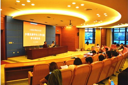 内派教师孙传庆就新疆地区近现代人文历史演进、社会经济发展情况做了详尽地介绍,梳理了中央关于民族工作的政策及法律法规,对高校少数民族学生的教育、管理和服务工作提出了建议。内派教师阿提开姆·黑力力就新疆籍少数民族学生的宗教与风俗习惯、日常生活状态与心态分析作了管理服务技巧方面的阐述。报告后,参会成员分成两组,就日常少数民族学生工作中存在的问题、难点、典型案例及本次研讨会的学习心得进行交流,并进行了总结发言。