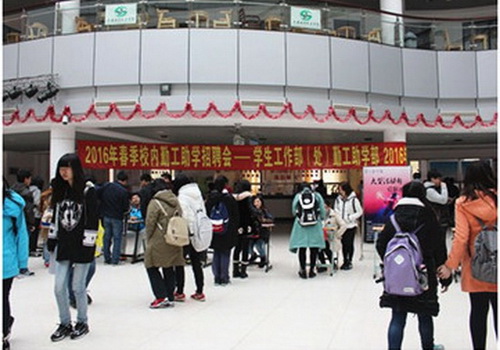 3月9日,2016年春季学期首场校内勤工助学岗位招聘会在校举行。许多前来应聘的学生早早地在各个岗位前排起了长队。本场招聘会共有30余个机关职能部门和单位参会,共招聘机关助理、校园电视台、教室打扫等200多个岗位。在招聘部门中,有代表性的包括勤工助学部新设的大型活动部,主要招纳在策划、组织能力上突出的学生进行培养;同时市场部、慈善爱心部、咖啡吧等岗位也吸引了不少学生。为了确保招聘会有序、顺利、安全地举行,主办方提前通过微信、短信、QQ群推送等形式发布招聘会公告和参会单位招聘岗位信息,方便同学们查询展位信息和参会须知。