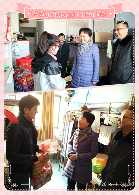 1月8日下午,校党委副书记、副校长张艳萍,学工部部长、校长办公室主任袁翔在学生处资助管理中心负责人、高职学院党总支书记、副院长的陪同下,来到徐汇校区学生宿舍看望并慰问了高职学院2名少数民族孤儿学生。