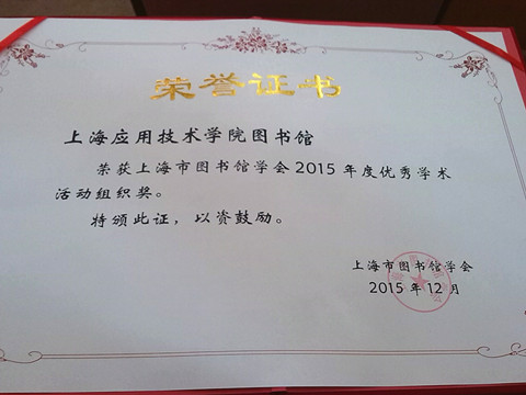 为充分调动上海各高校图书馆的积极性,表彰为推动和繁荣学会学术活动作出贡献和成绩的先进集体,在12月25日举行的上海市图书馆学会2015年学术年会上,我校图书馆荣获上海市图书馆学会2015年度优秀学术活动组织奖。今年共有26家单位获得此殊荣,其中公共图书馆15家,高校图书馆11家。我校图书馆从2008年起,已连续八年获得此项荣誉。