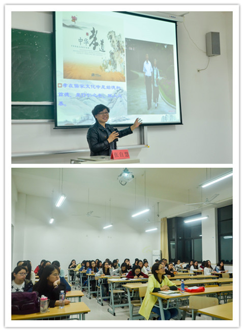 讲座伊始,张自慧指出传统孝道面临严峻挑战,孝亲尊老意识淡漠,责任担当缺失。面对孝文化的发展现状,她特别强调“孝在儒家文化中是始德和首德,是行仁之本、做人之基。”接着,张自慧简述传统孝道的内涵。她认为孝道体现在以下三大方面:一、孝顺、尊敬父母。立身立功,以显父母;对父母尽赡养义务,与父母交谈时注意分寸;对父母敬养,以和气、愉色、婉容之态与父母相处。二、尊重、关爱天下老人。以广阔之胸襟、深切之情怀把关爱向周围传递。三、忠君与报效国家。孝道不仅体现在尊老,更体现在爱国。随后还阐释了孝道伦理的失范与成因。孝道伦理失范表现在代际回馈失衡;孝道失范的原因主要体现在孝道文化的断裂与孝道教育的欠缺,以及多元价值观的冲击、市场法则的影响。最后,张自慧提出“今天我们如何行孝”这一深刻问题,在日常生活中,我们应当感恩父母、孝敬父母,以自身的成人与成才来报答父母。从身边小事做起,多一句关心,少一分烦躁,心怀恩情,平和相处。